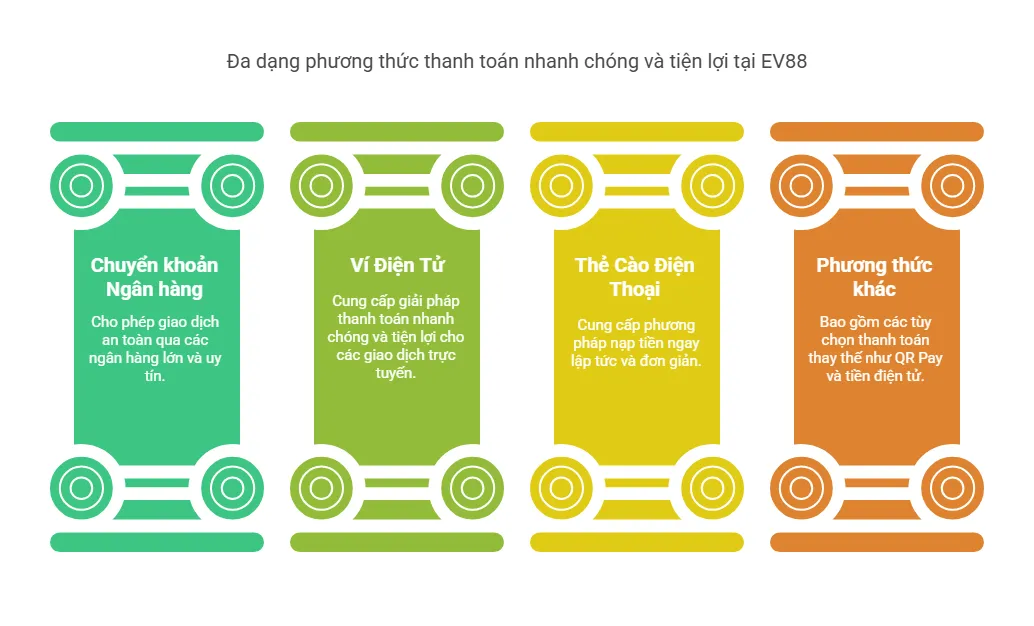 EV88 hỗ trợ nạp/rút tiền qua nhiều kênh: Chuyển khoản Ngân hàng (Vietcombank, Techcombank…), Ví điện tử (Momo, ZaloPay, ViettelPay), Thẻ cào điện thoại. Giao dịch nhanh chóng, tiện lợi, an toàn. Có thể hỗ trợ thêm QR Pay, Tiền điện tử (vui lòng kiểm tra cập nhật tại EV88).